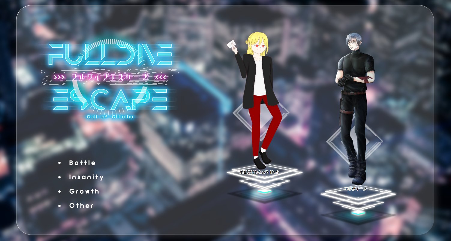 「フルダイブエスケープ」 クトゥルフ神話TRPG 2024.11.17 クトゥルフ神話TRPG「フルダイブエスケープ」作:氷雨様KPC/KP:エリツィーノ/シキPC/PL:本宮 慧/ハルジオン END-A 2024/6/27