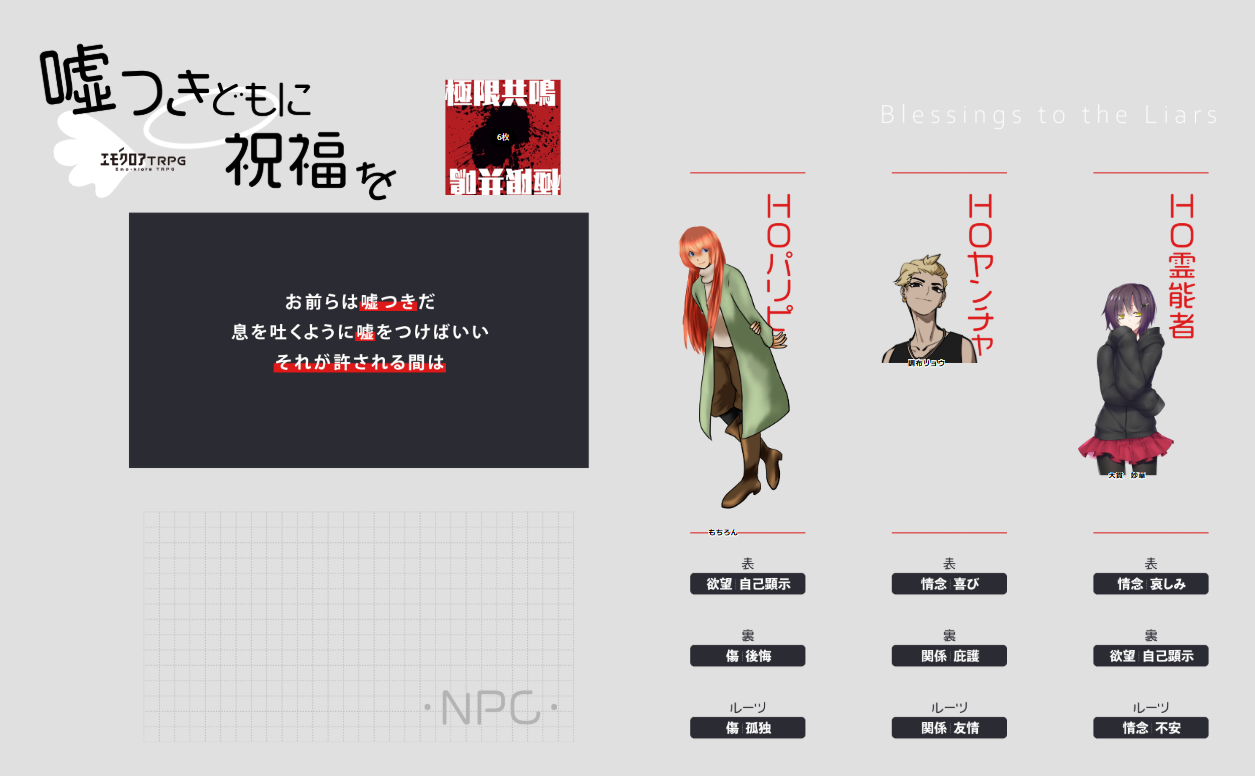 「嘘つきどもに祝福を」3陣目 エモクロアTRPG 2025.03.19 エモクロアTRPG「嘘つきどもに祝福を」作:ぱぱびっぷ様DL:シキHOパリピ:望野 崙/かまたいちさんHOヤンチャ:調布 リョウ/あいのさんHO霊能者:大貫 妙華/あきさん 全生還 25/3/18