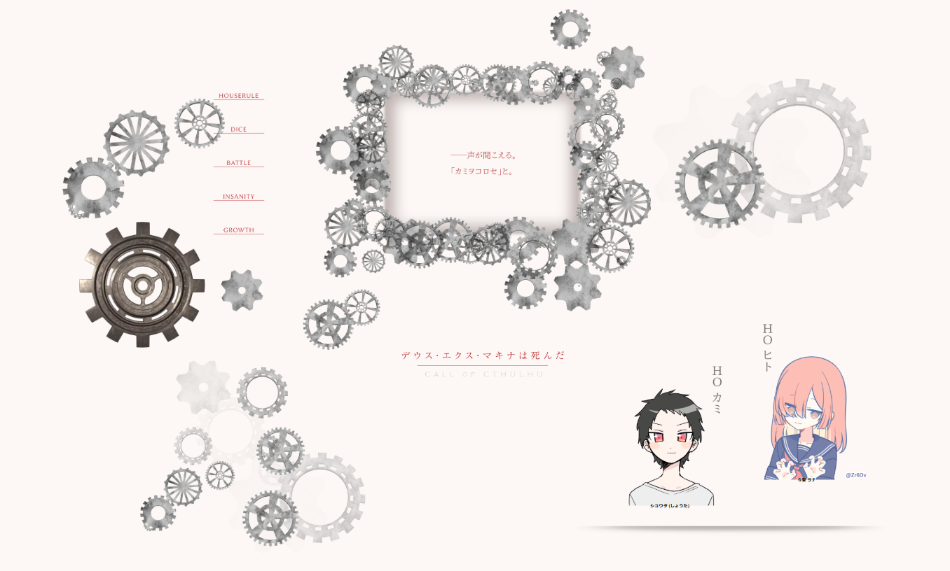 「デウス・エクス・マキナは死んだ」3陣目 クトゥルフ神話TRPG 2025.03.27 クトゥルフ神話TRPG「デウス・エクス・マキナは死んだ」作:茶鰯様KP:シキHOカミ:ショウタ/ゆきさんHOヒト:今愛 ラナ/ぷもももさん 両生還 2025/3/26