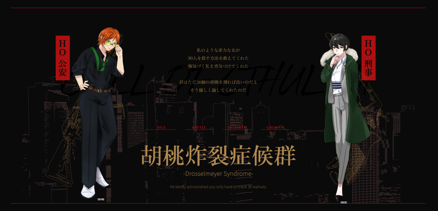 「胡桃炸裂症候群-Drosselmeyer Syndrome-」1陣目 クトゥルフ神話TRPG 2025.03.30 クトゥルフ神話TRPG「胡桃炸裂症候群-Drosselmeyer Syndrome-」作:あお様KP:シキHO公安:暘多 李哇/みるまさんHO刑事:鷹匠 夏芽/侘茶さん END-D 両生還 2025/3/30