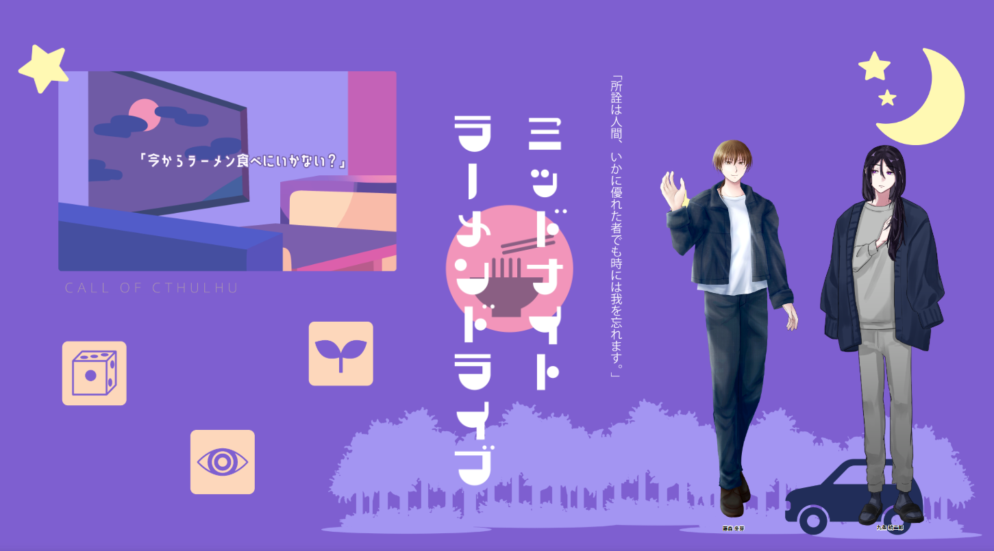 「ミッドナイトラーメンドライブ」 クトゥルフ神話TRPG 2025.04.12 クトゥルフ神話TRPG「ミッドナイトラーメンドライブ」作:ピンク屋さんKPC/KP:藤森冬芽(ふじもり とうが)PC/PL:九条 統二郎(くじょう とうじろう)/侘茶さん