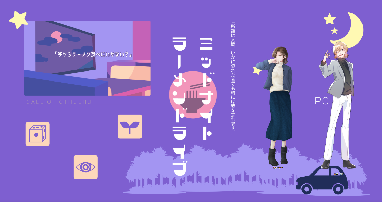 「ミッドナイトラーメンドライブ」2陣目 クトゥルフ神話TRPG 2025.05.14 クトゥルフ神話TRPG「ミッドナイトラーメンドライブ」作:ピンク屋さんKPC/KP:花本 サクラ(はなもと さくら)/シキPC/PL:富山 正敏(とみやま まさとし)/ムラサキさん 2025/5/14