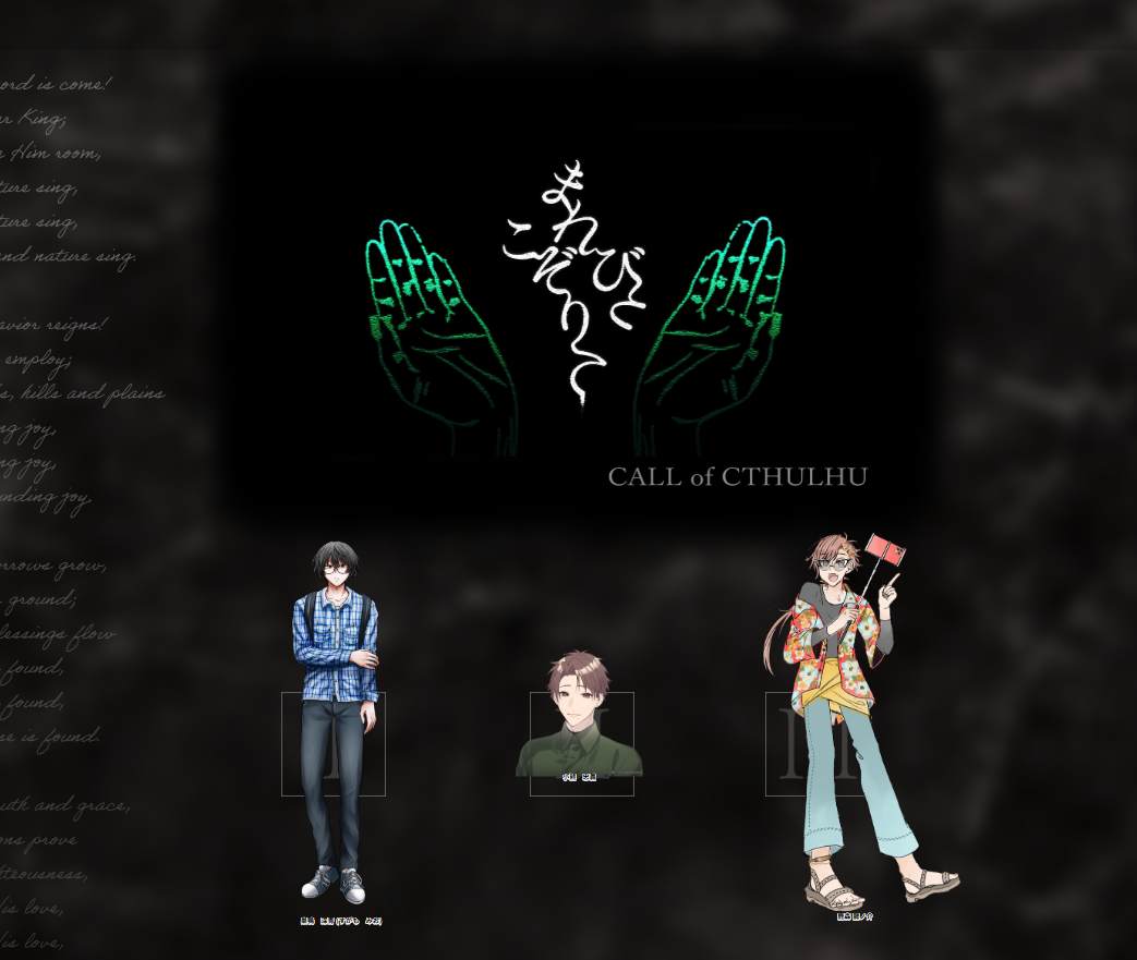 「まれびとこぞりて」5陣目 クトゥルフ神話TRPG 2025.05.17 クトゥルフ神話TRPG「まれびとこぞりて」作:文町様KP:シキPC/PL:巣鴨 深青/徒花 空良さん小熊 忠義/ひとみさん鹿森 龍ノ介/増田さん 2生還1ロスト 2025/5/15
