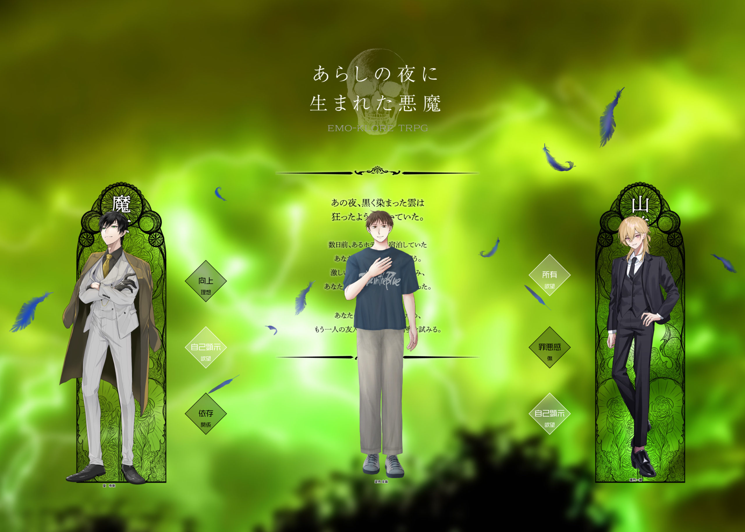 「あらしの夜に生まれた悪魔」2陣目 エモクロアTRPG 2025.07.26 エモクロアTRPG「あらしの夜に生まれた悪魔」作:霧島ジャック様DL:シキHO魔女:篁 弥勒(たかむら みろく)/らいさんHO山羊:亜門一郷(あもんいちごう)/眠り熊さん ENDB2025/7/26