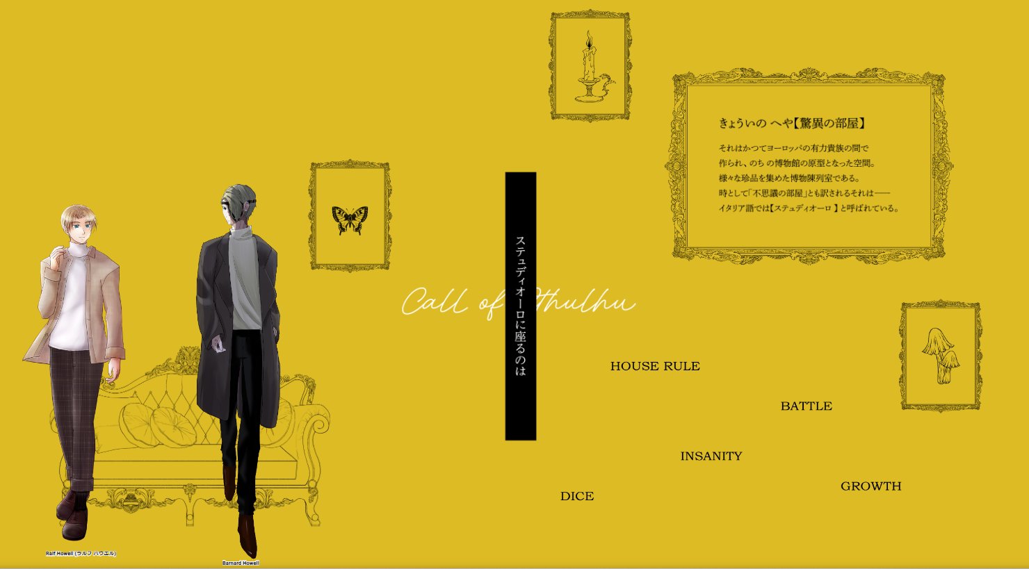 「ステュディオーロに座るのは」 クトゥルフ神話TRPG 2024.11.14 クトゥルフ神話TRPG「ステュディオーロに座るのは」作:性癖博覧会様KPC/KP:ラルフ・ハウエル/シキPC/PL:バーナード・ハウエル/侘茶さん ENDA 2024/7/7